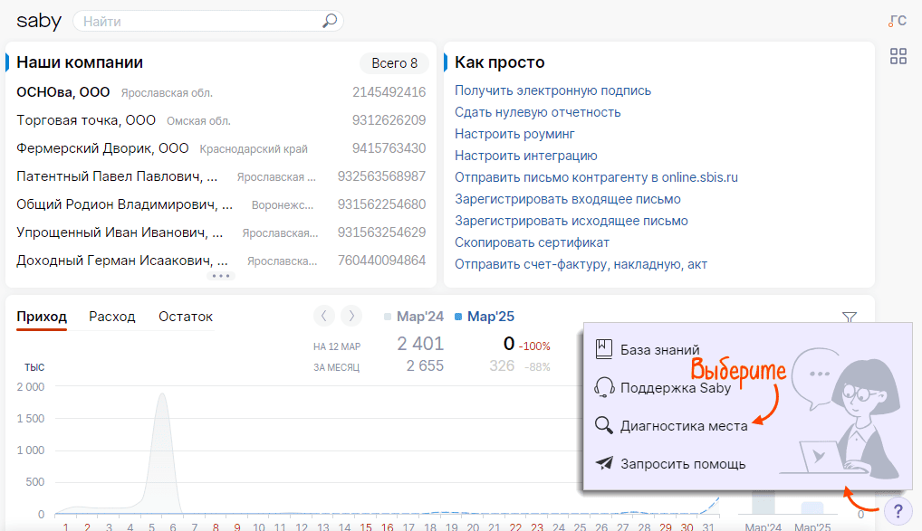 2. Запустить Мастер настройки. В Saby это можно сделать в любом разделе личного кабинета, кликнув на значок профиля и выбрав пункт «Диагностика места». Или перейти по прямой ссылке: https://online.saby.ru/reg/
