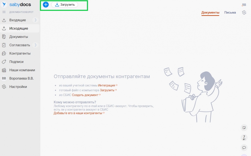 В личном кабинете Saby пользователи могут загружать и отправлять файлы, а также отслеживать статус их обработки в режиме реального времени.