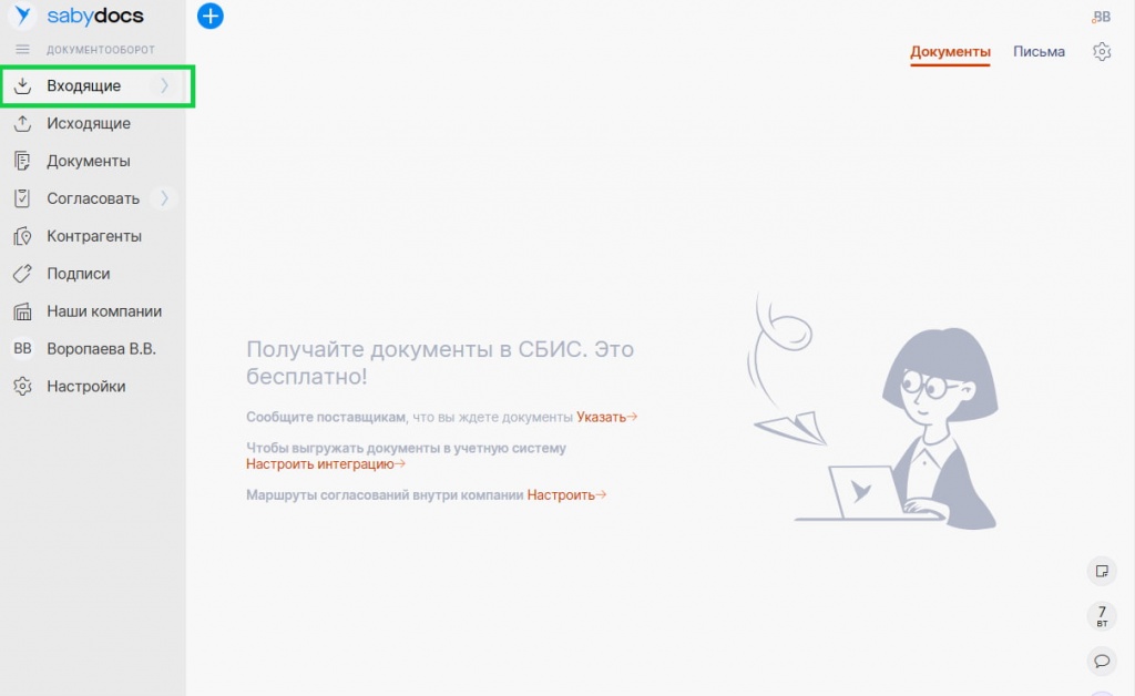 1. Для обработки входящего документа нужно открыть его через раздел «Документы» → «Входящие».