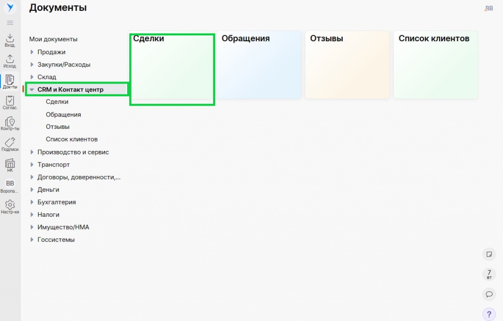 1. Открыть раздел «Документы» → «Исходящие» или «CRM/Сделки».