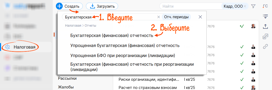 1. Перейти в разделе «Отчетность/Налоговая/Отчеты» через опцию создания выбрать в списке нужную форму — «Бухгалтерская (финансовая) отчетность», КНД 0710099.