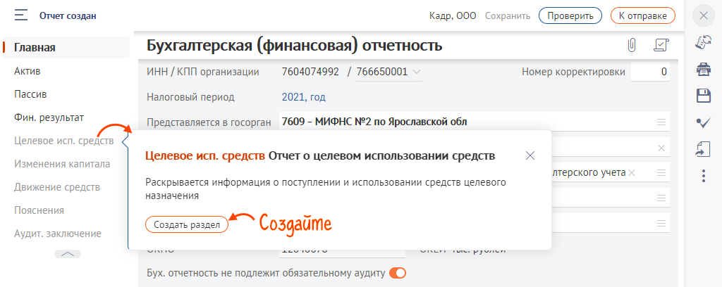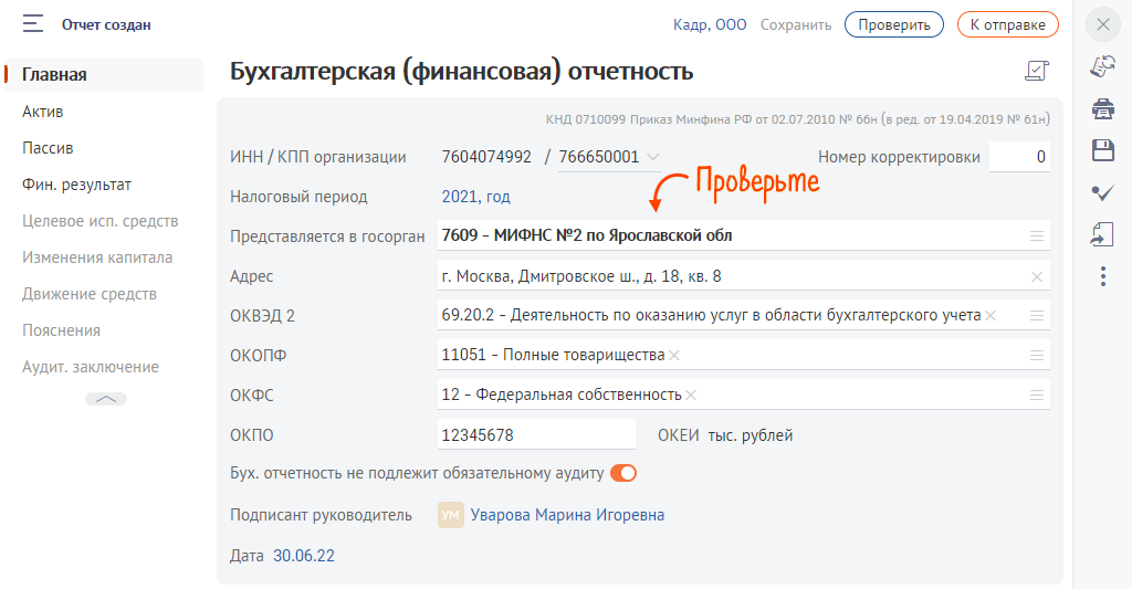 8. Кликнуть «Проверить», чтобы запустить проверку. Если ошибок не выявлено, можно отправлять отчет по кнопке «К отправке». После принятия отчета инспекция высылает извещение.