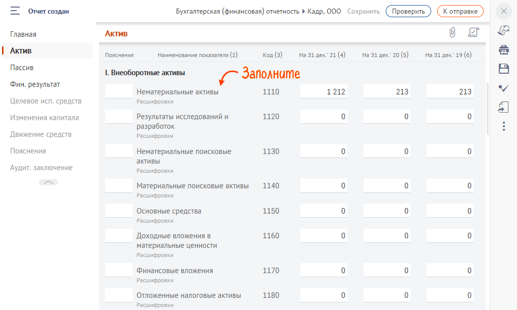 - внести суммы в разделе «Бухгалтерский баланс» и нули в разделе «Отчет о финансовых результатах».