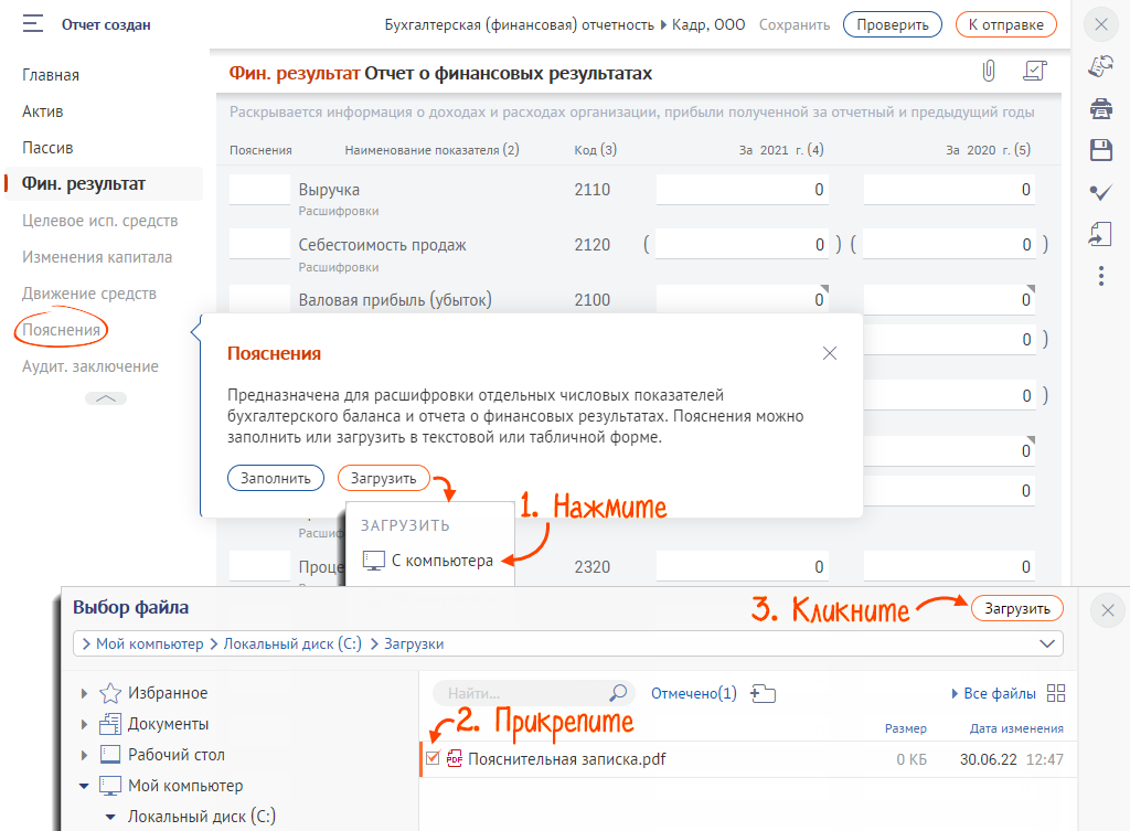 7. При наличии пояснительной записки или аудиторского заключения их необходимо приложить к отчету. Аудиторское заключение можно загрузить и отправить вместе с бухгалтерской отчетностью либо отдельно в течение 10 рабочих дней со дня его подписания.